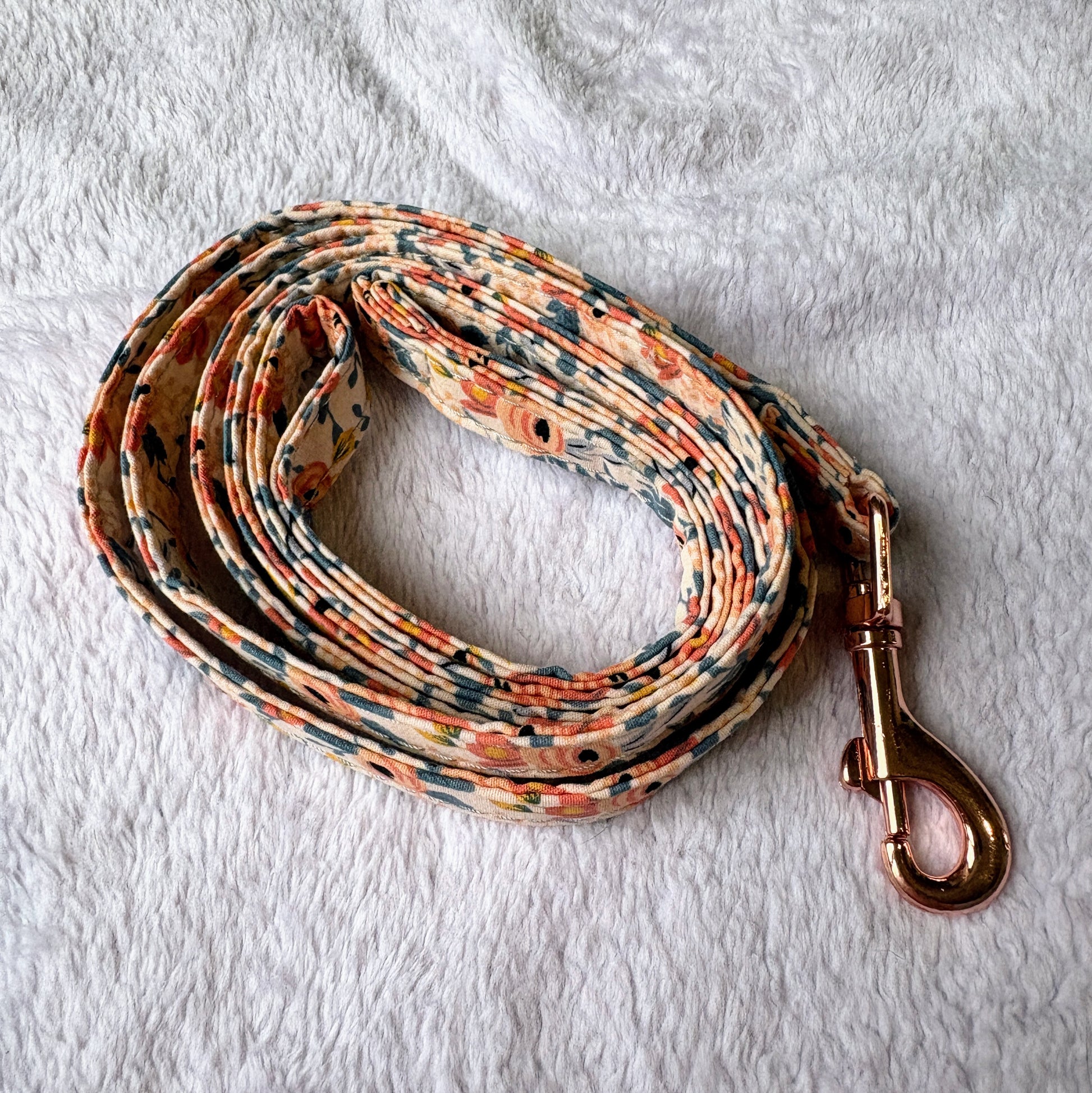Contient : collier ajustable fleuri rose avec médaillon gravé à la main ( possibilité d'ajouter un numéro de téléphone au dos ), laisse assortie (1,50 m), patère gravée à la main, coffret avec ruban, papier marbré, carte et sticker.